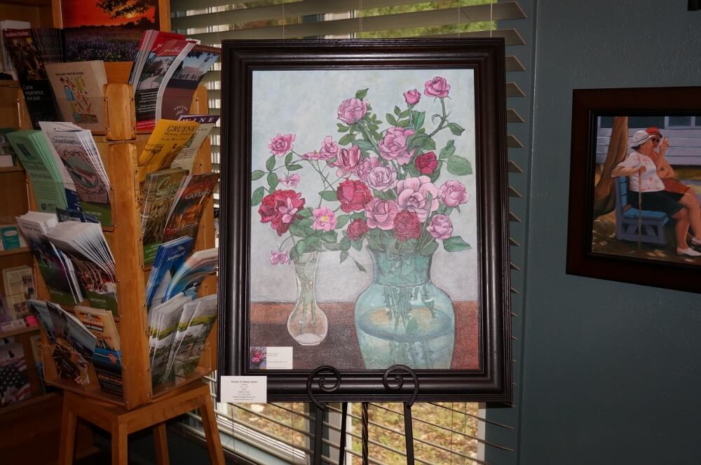 "Roses In Glass Vases" is displayed at the Wimberley Visitor Center in May 2018.